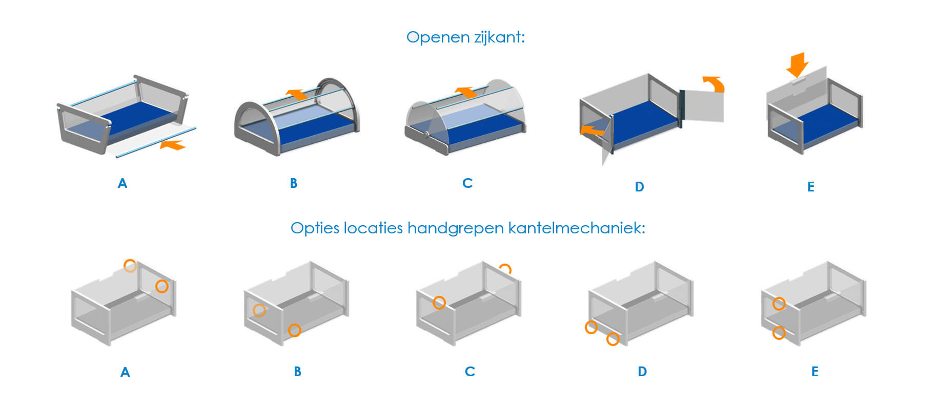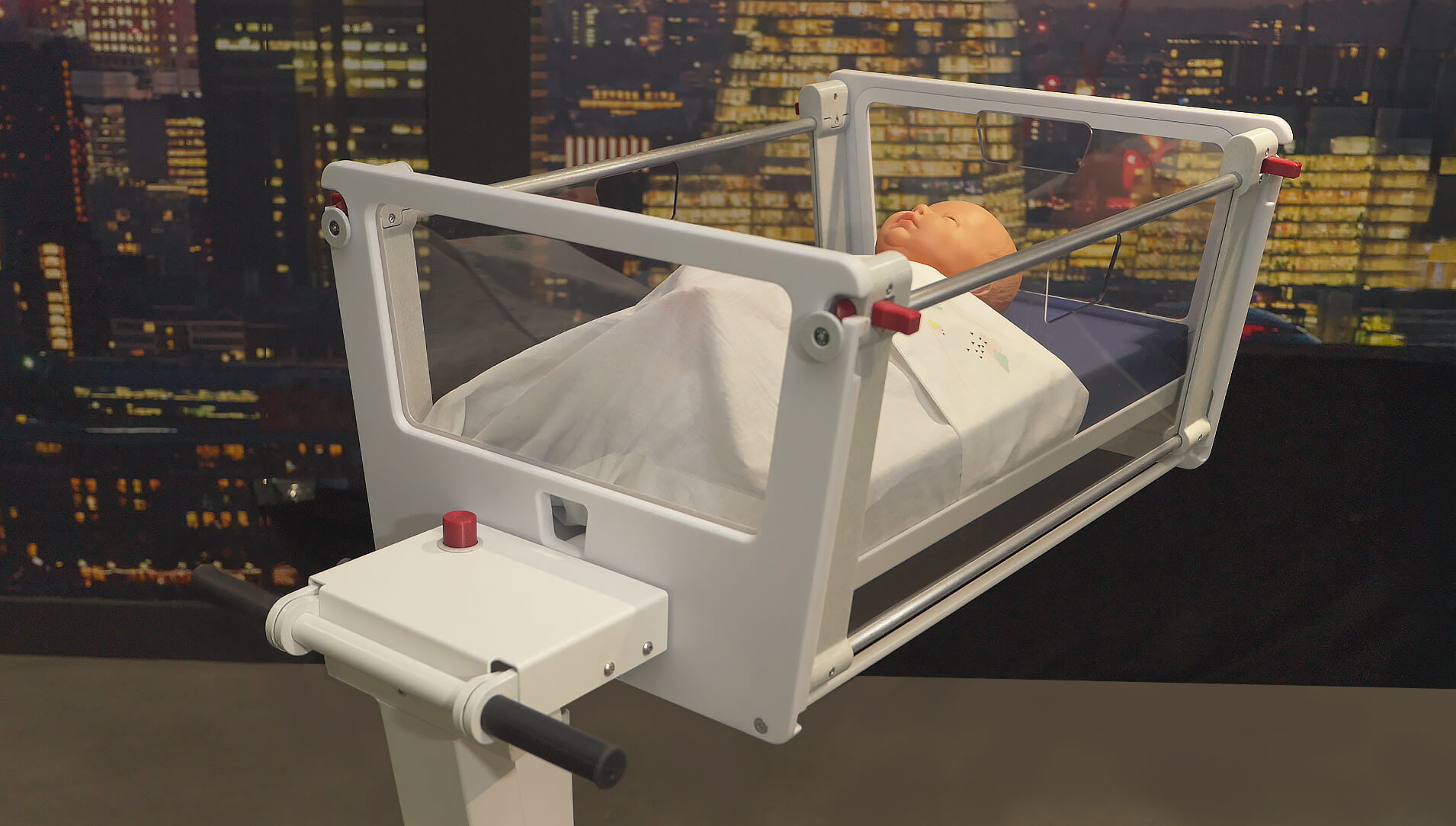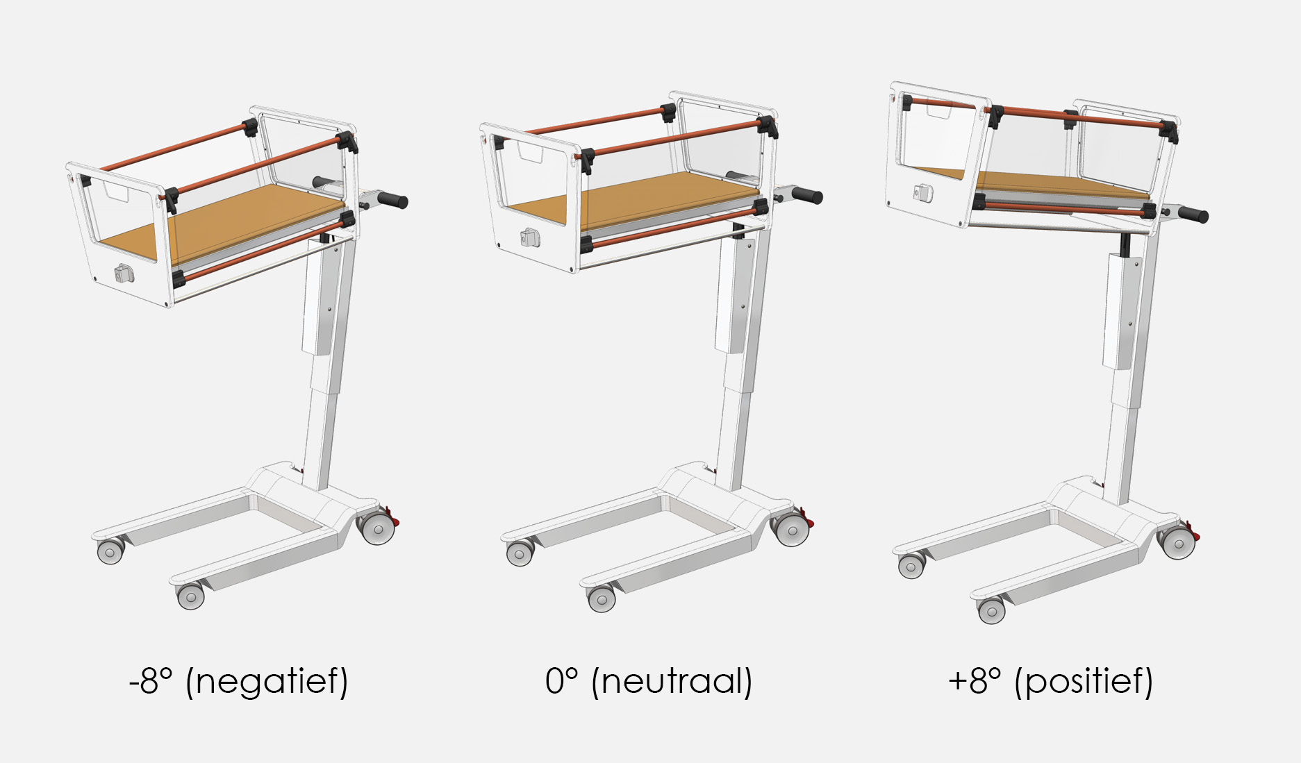 A major part of the redesign focused on adding and improving functionality. The crib can now be opened on both sides down to just below the mattress, without allowing both sides to be opened simultaneously. In addition, the tilting mechanism was completely redesigned, enabling effortless operation of Trendelenburg positions, as shown on the right.